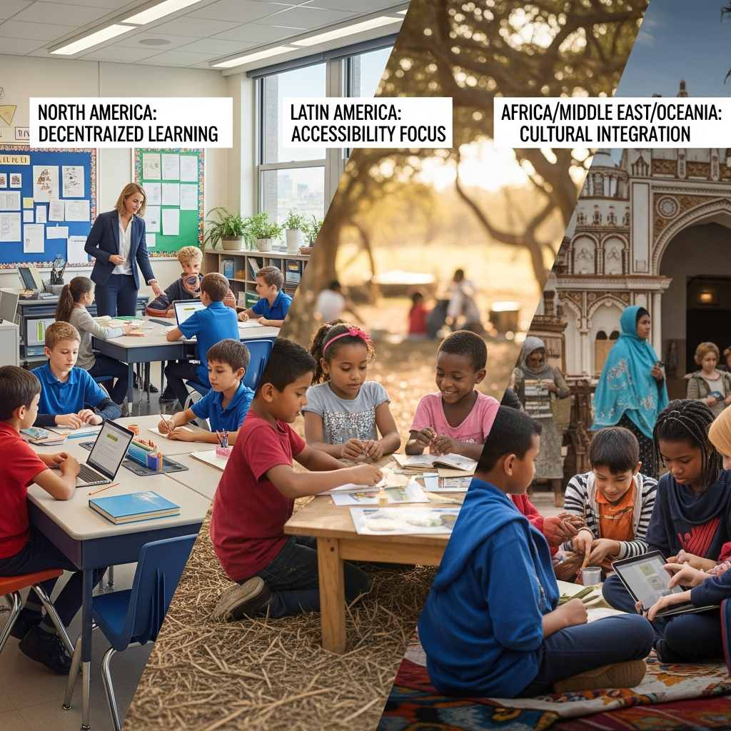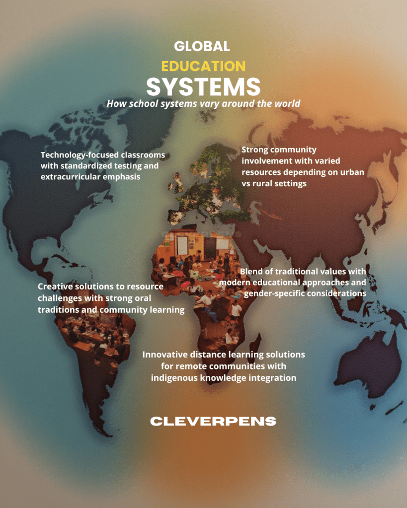 | The Rest of the World | Encompassing Africa, the Middle East, and Oceania, the influence of colonial histories and resource-related challenges contributes greatly to the development of these systems. Important Areas: Africa: Nations like Nigeria and South Africa are focusing on improving access to basic education and addressing inequalities from the apartheid era. Middle East: The UAE and Saudi Arabia are evolving their systems, while Israel emphasizes a robust STEM educational approach. Oceania: Australia and New Zealand adopt Anglo-American models, whereas the Pacific Islands emphasize the importance of cultural relevance in education. | Common themes focus on tackling resource constraints, promoting cultural integration, and strengthening resilience to conflicts and climate challenges. |